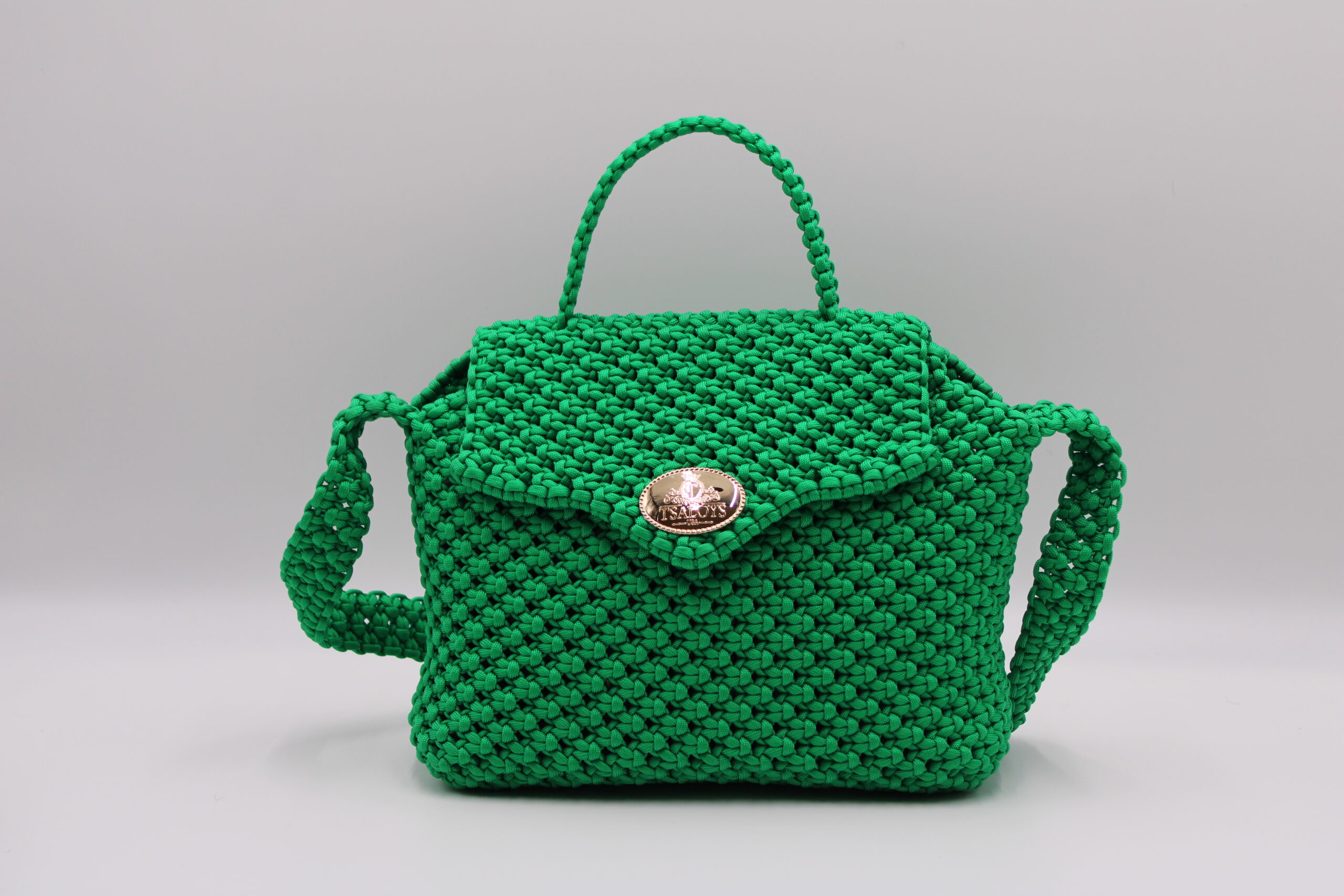 Flap and closure in TSALOYS oval LOGO made with zinc alloy and golden magnetic clasp.