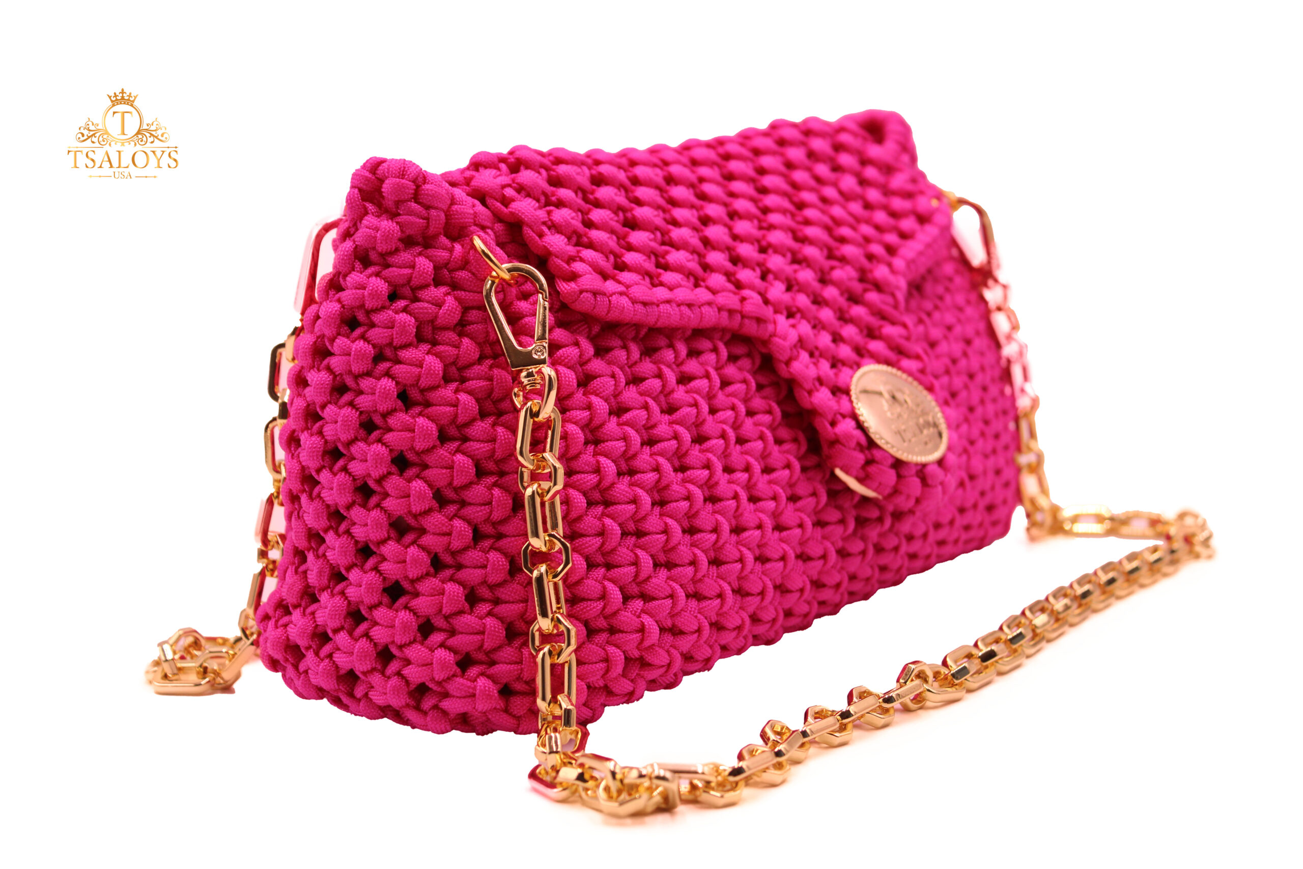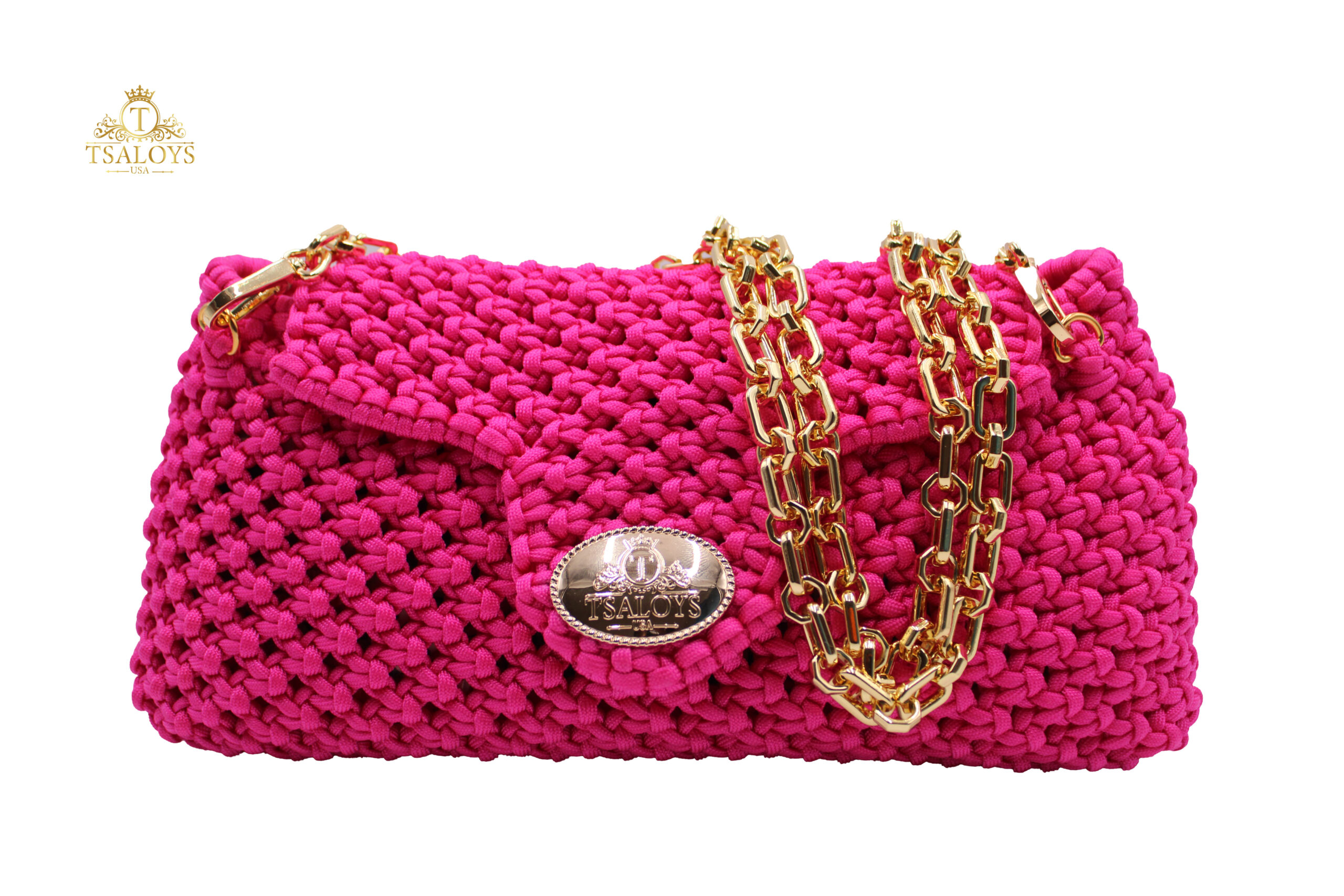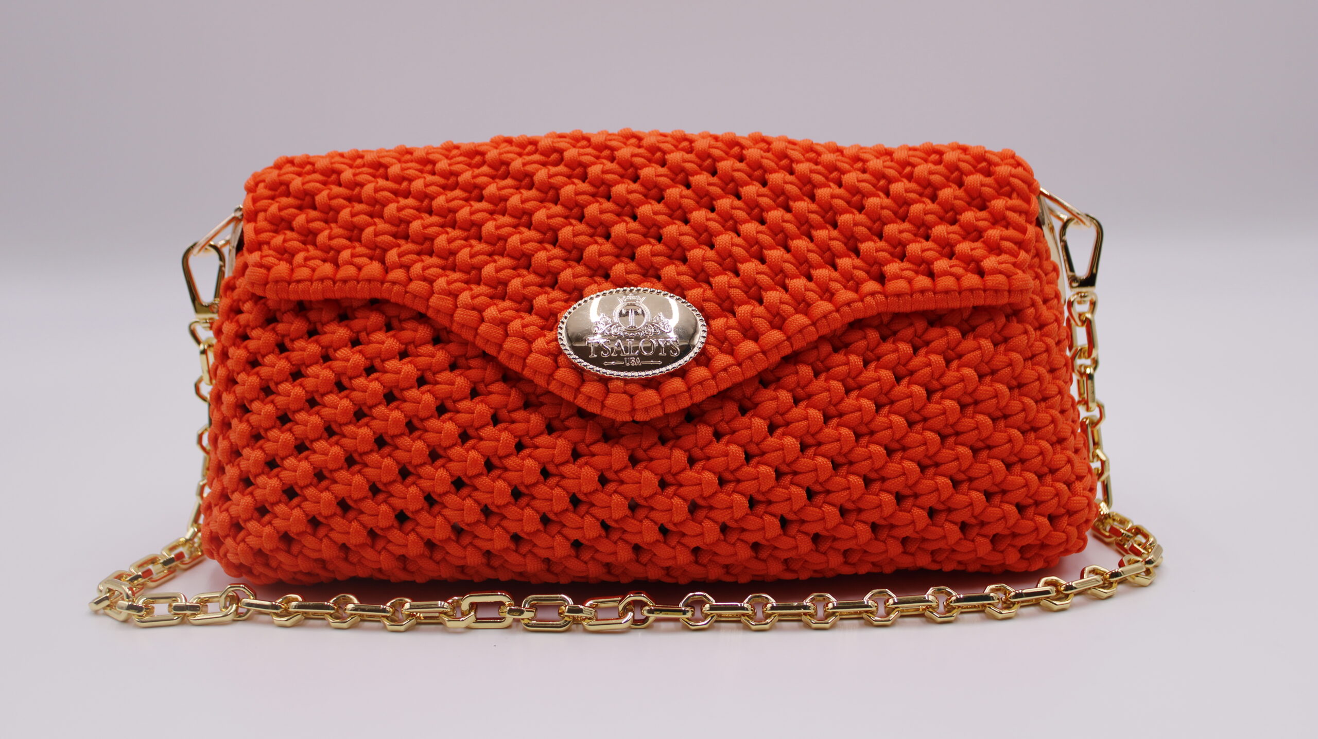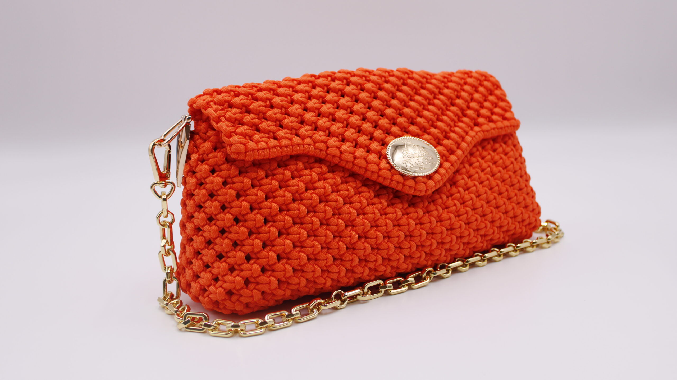 Flap and closure in TSALOYS oval LOGO in zinc alloy with golden magnetic clasp.