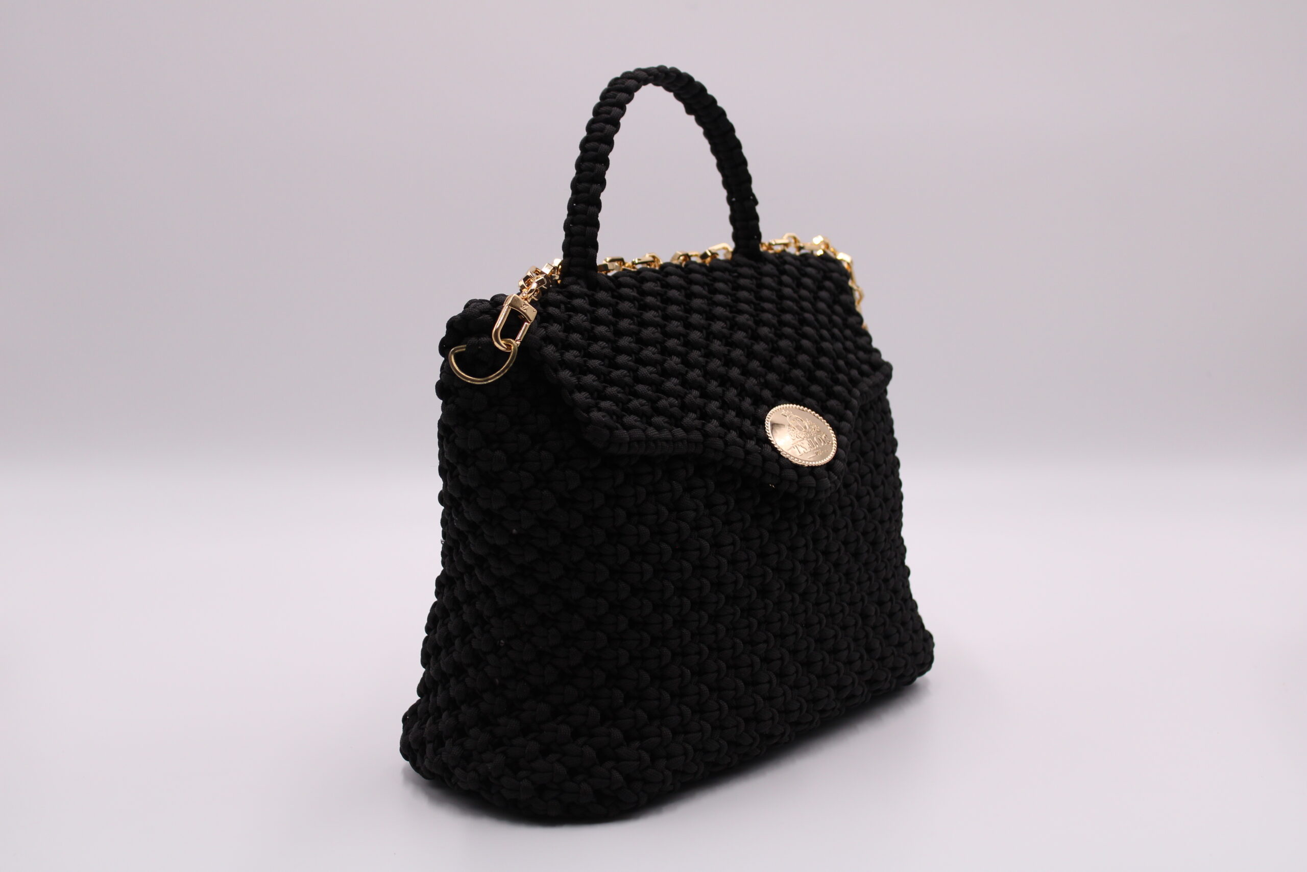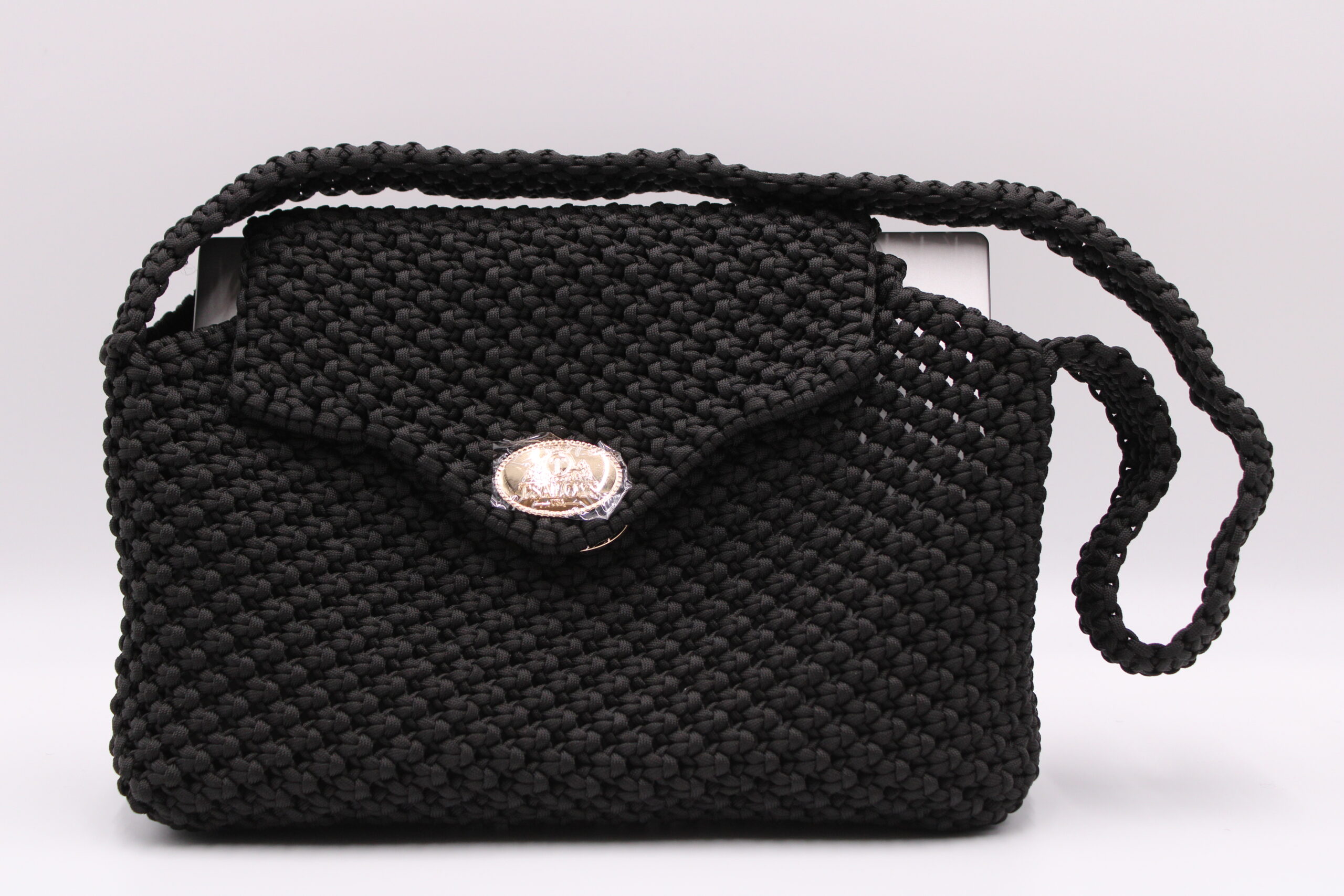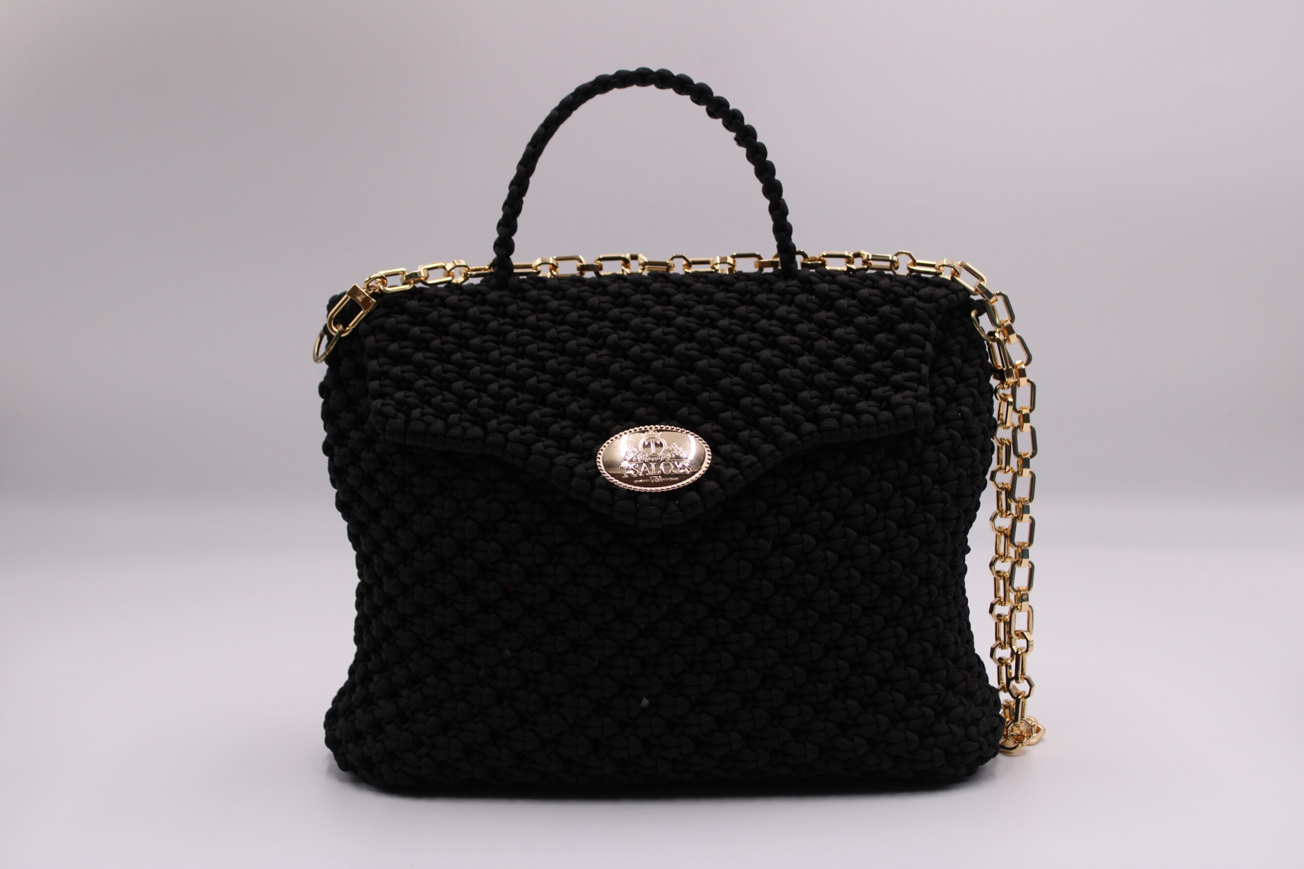 Flap and closure in TSALOYS oval LOGO in zinc alloy with golden magnetic clasp.