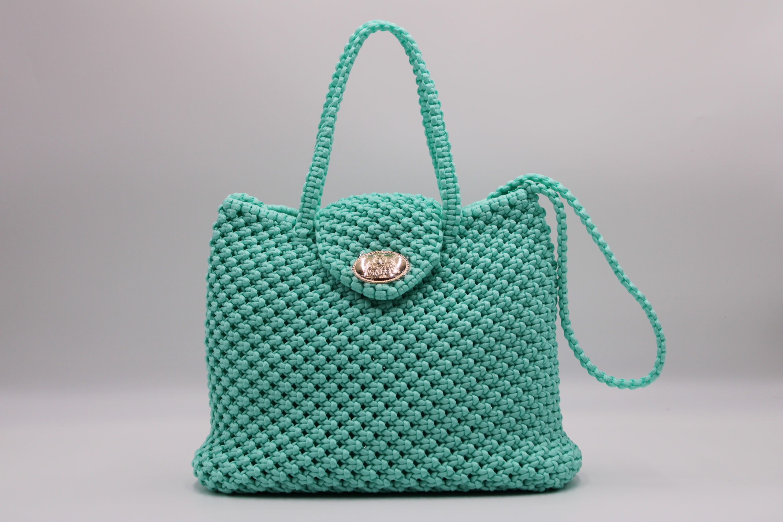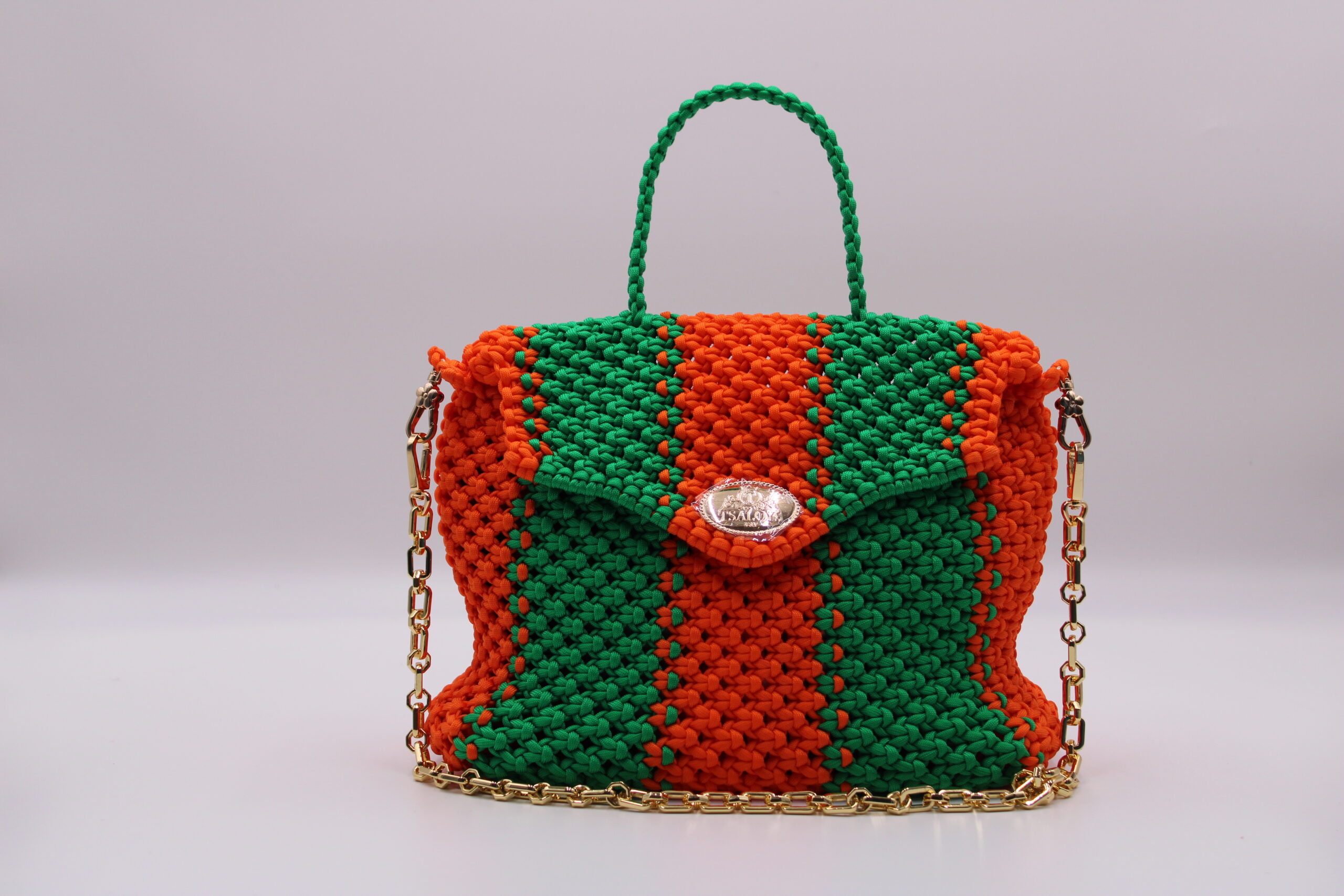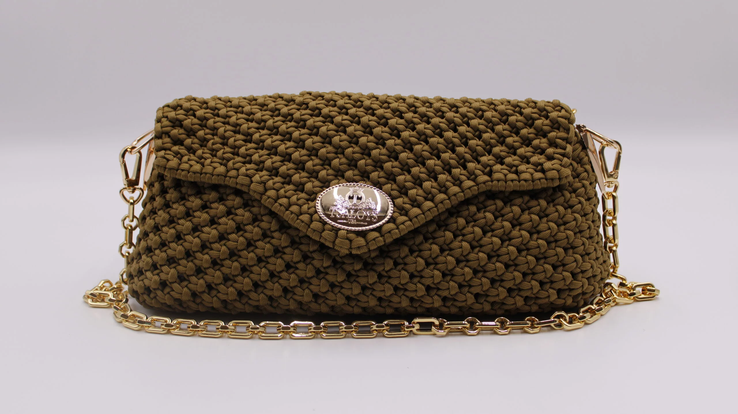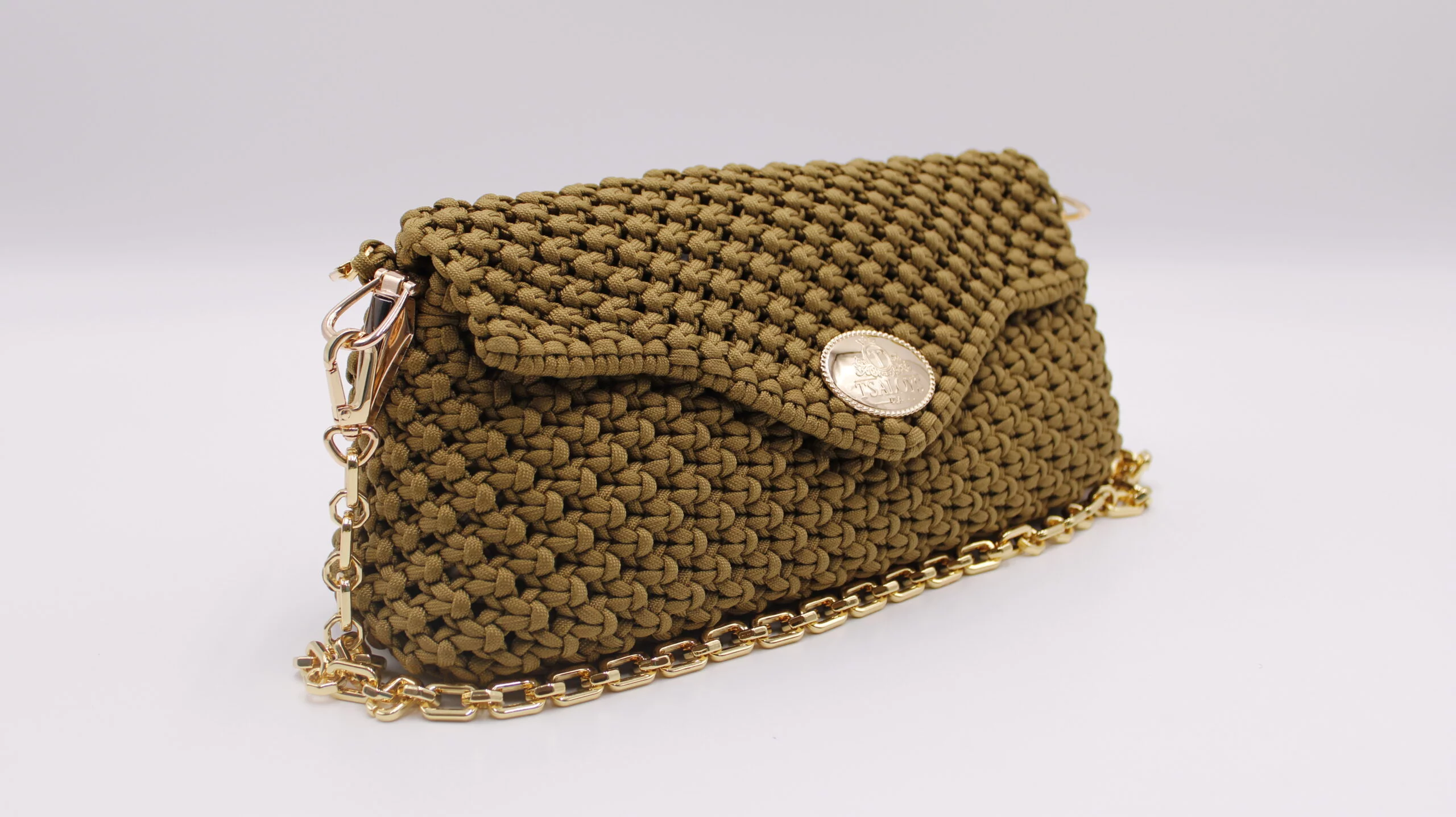 Flap and closure in TSALOYS oval LOGO in zinc alloy with golden magnetic clasp.
